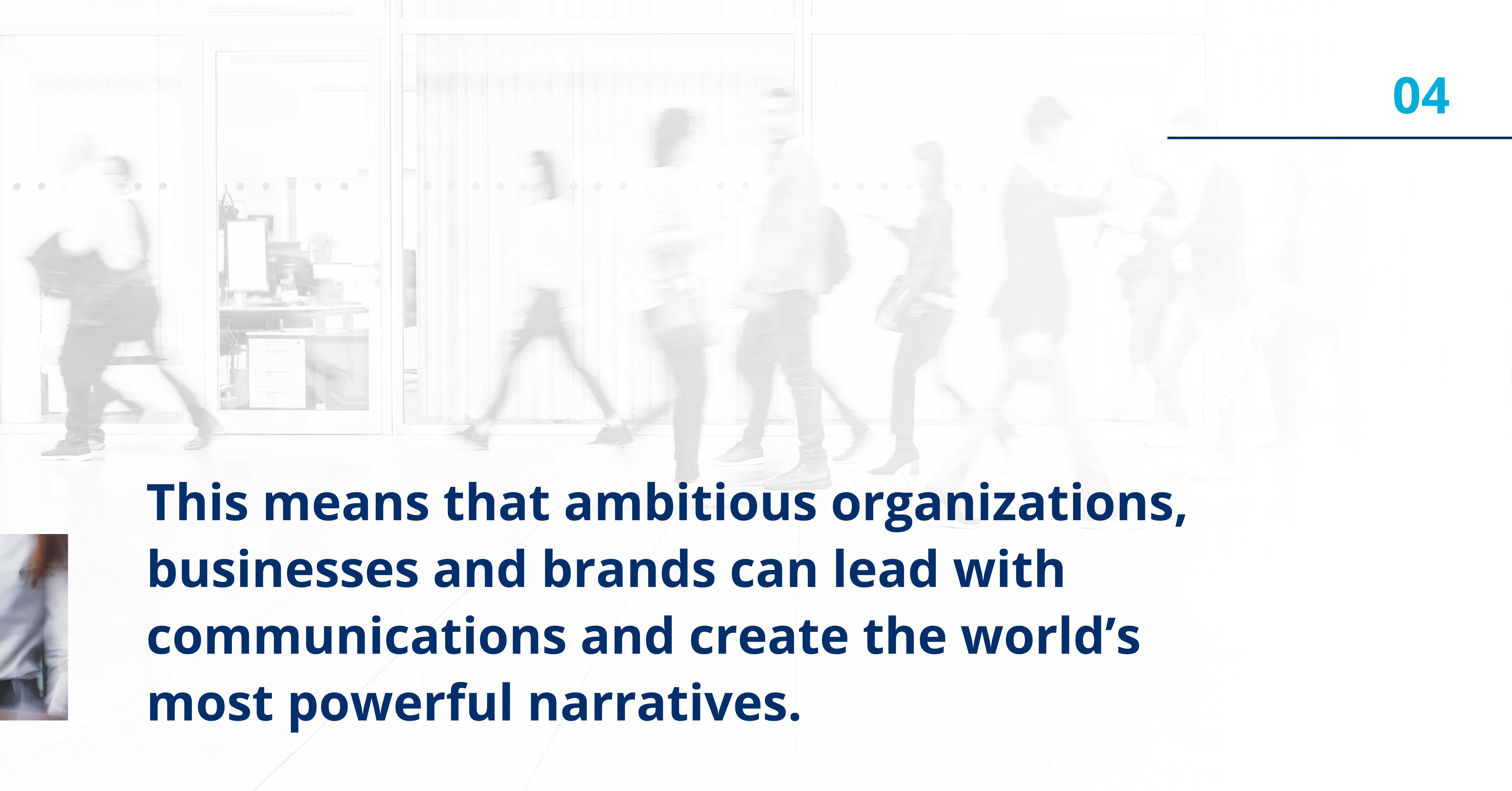 We want to change what people see, feel, think and remember. We study the audience and take a story-led approach to engage stakeholders with the right interactions, at the right time and in the right places.